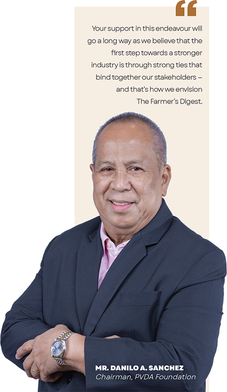 Let me take this opportunity to thank the leadership of the PVDA and PVDA Foundation for ensuring this much-awaited International Farmers Summit 2022 to happen. This momentous event encourages us to participate and to share our part on its advocacy. As PVDA Foundation President, we thank the PVDA, led by our young & vibrant leaders, for taking the challenge to work with our industry experts together with the DA,BAI, FDA and FPA to be at the forefront of recovery efforts for the swine & poultry industries. They have launched their ASF control, prevention and swine repopulation, and rabies awareness campaigns in the swine farming and companion animal care respectively. We know that recovery implies overcoming adversities and achieving normalization with multiple interventions not limited to veterinary care solutions. In this regard, the PVDA and PVDA Foundation are jointly launching its maiden issue of the Farmer's Digest having both local and international contents, These include updates on the swine, cattle, poultry- both backyard and commercial, the companion animal & exotic creatures industries, the PVDA membership, government agriculture sectors, among others to offer and share relevant information towards the overall development of the agricultural industry as a whole. We hope that our campaign and sharing contents through this newsletter can inject additional excitement in our agricultural, poultry and livestock farming, pet-care community and exotic creatures. Once again, let me extend my sincere congratulations to the IFS Chairman, Mr Danilo A. Sanchez and its Officers, to the PVDA officers, to all men & women who are behind this noble project. Another milestone achievement ! Mabuhay tayong lahat !